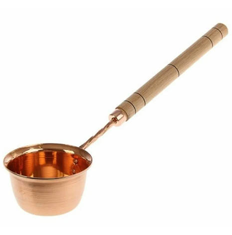 Небольшой медный черпак понадобится в бане чтобы плеснуть воды на каменку, взять кипятка из чана или разбрызгать в парной ароматный травяной настой.