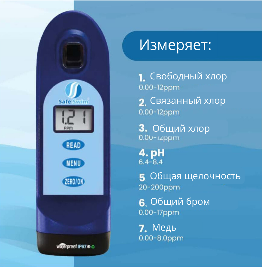 Электронные pH-метры (Фотометр для бассейна Safe swim, WATERIGA) – компактные и недорогие измерительные приборы, которые обеспечивают простое измерение заданных параметров воды в бассейне с фиксацией температуры, даты и времени.
