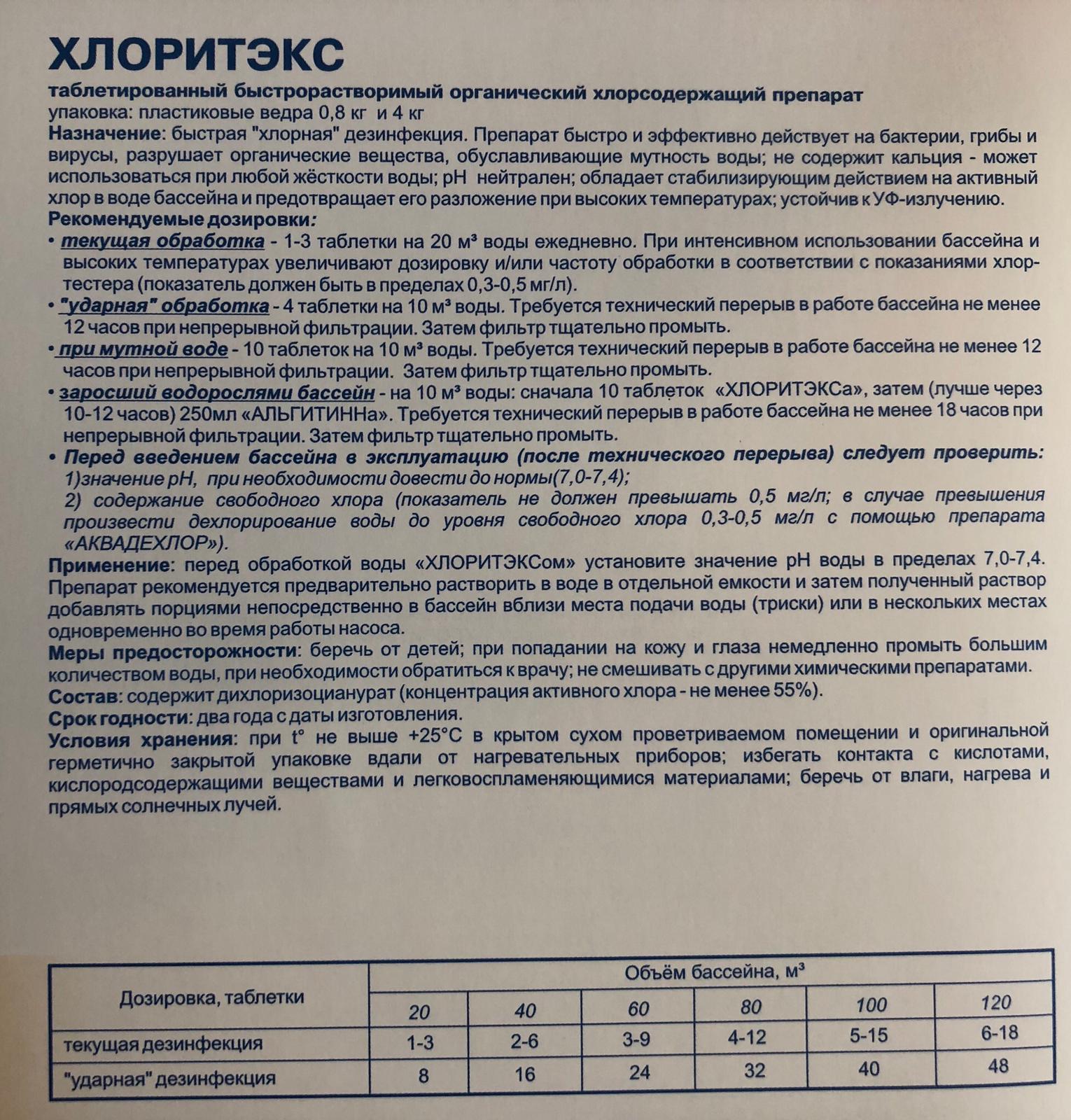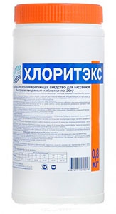 Хлоритэкс представляет собой быстрорастворимый препарат для хлорирования воды. В нём нет содержит кальция, поэтому при дезинфекции не изменяется pH воды бассейна и не происходит кальциевых отложений.