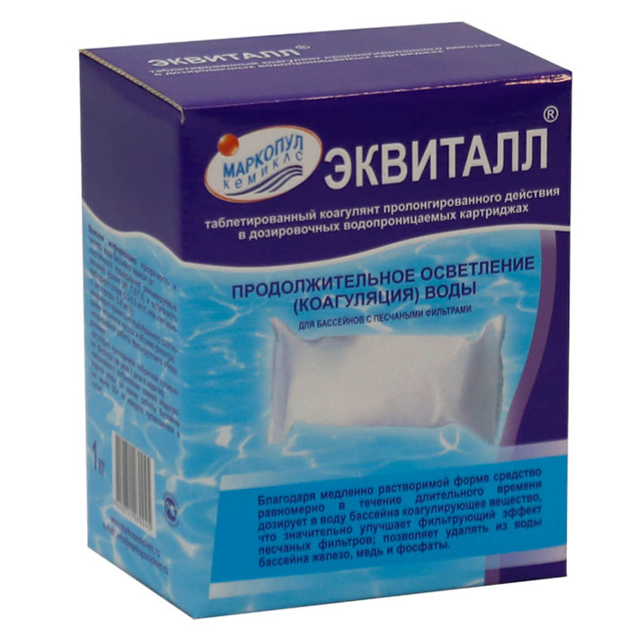 Кроме того, ЭКВИТАЛЛ длительного действия позволяет удалять из воды железо, медь, фосфаты. Оптимальное действие препарата при значении рН 7,2-7,6.