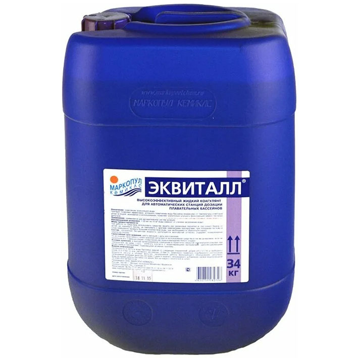 Перед проведением коагуляции следует проверить и при необходимости довести до нормы значения рН (7,0-7,4) и свободного хлора (0,3-0,6 мг/л), 90 — 180 мл «Эквиталла» очень медленно вливают в скиммер при работающем циркуляционном насосе, после чего необходимо выключить насос на 20 мин (для накопления слоя хлопьев).