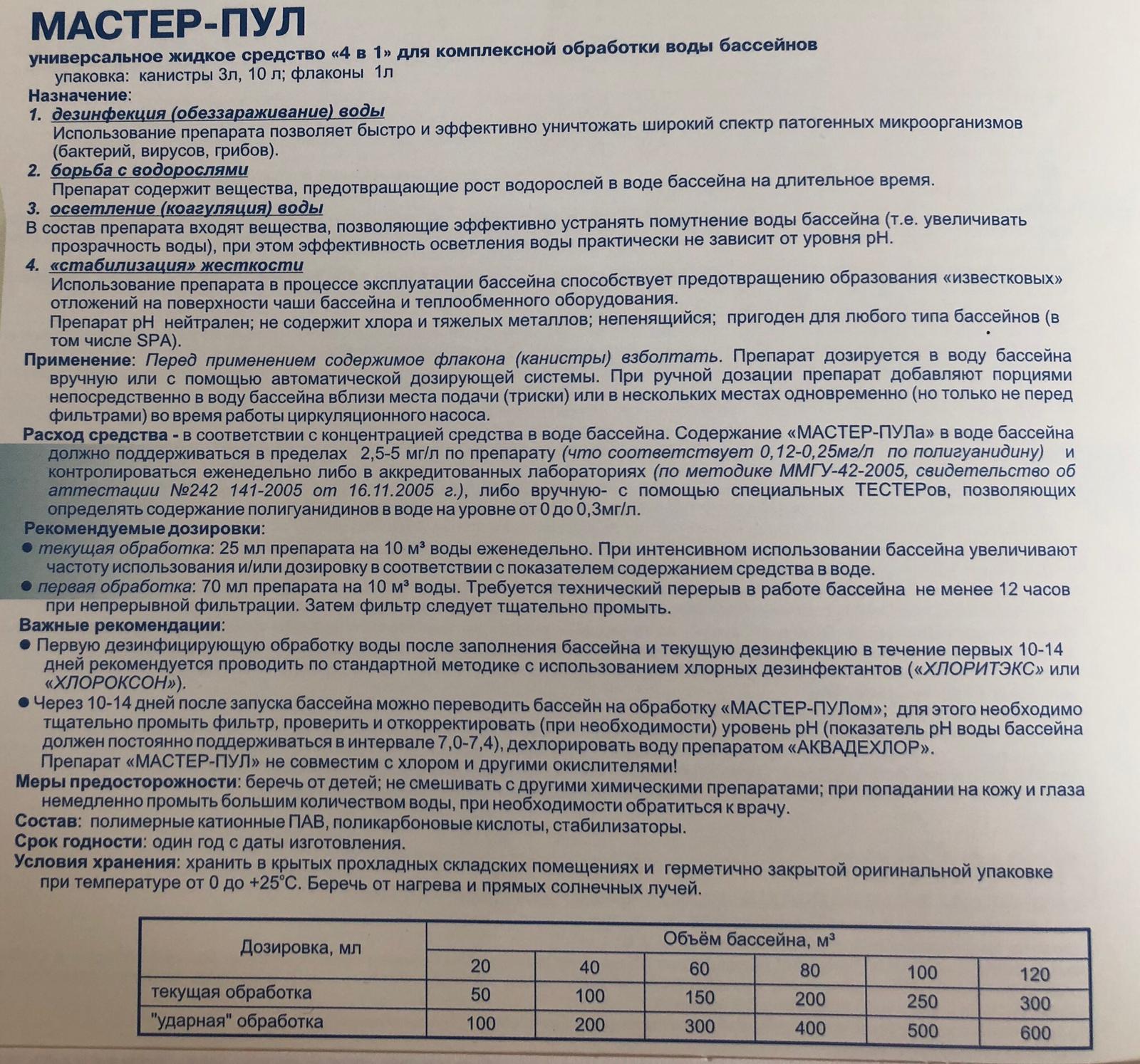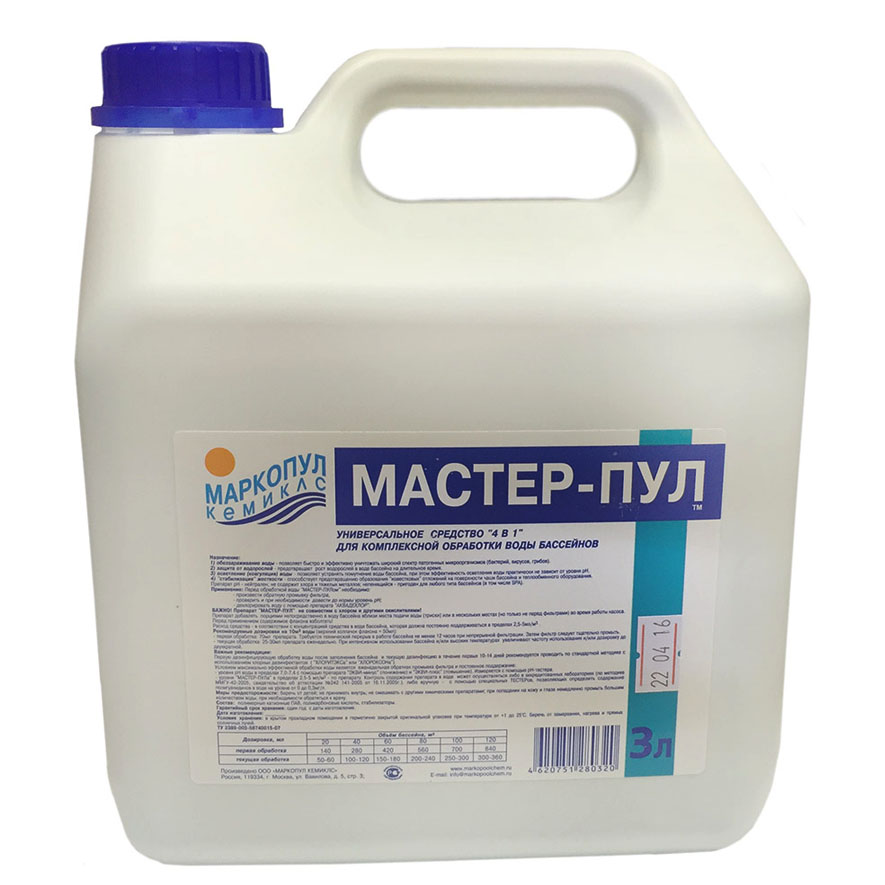 Описание «Мастер-пул» это универсальное жидкое средство «4 в 1» для комплексной обработки воды плавательных бассейнов.