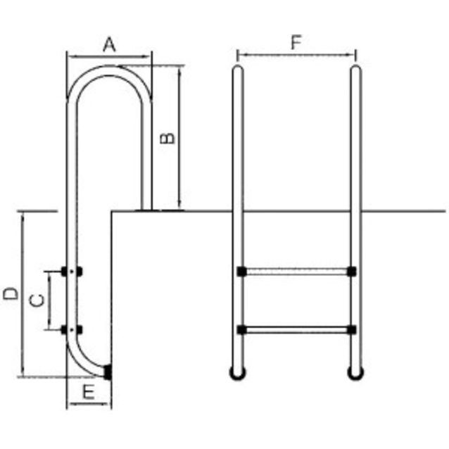 Монтаж лестницы выполняется в верхней части бассейна при помощи болтов из нержавеющей стали и закладного стакана (анкера). Нижняя часть лестницы упирается в стену бассейна резиновыми заглушками.