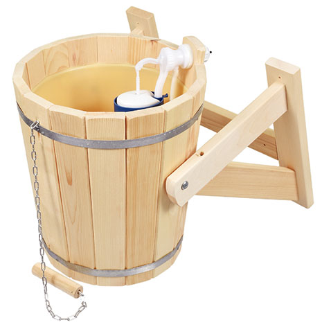 Обливное устройство сделано из кедра, имеет пластиковую вставку. Оно крепиться к стене на высоте 2 метра от пола. Наполненная ёмкость опрокидывается при помощи верёвки, прикреплённой к устройству. Обливное устройство для бани усилено металлическими обручами. Вода подаётся автоматически (необходимо подключение к водопроводу).