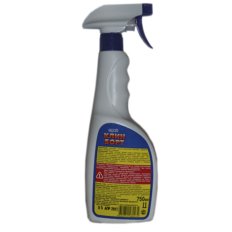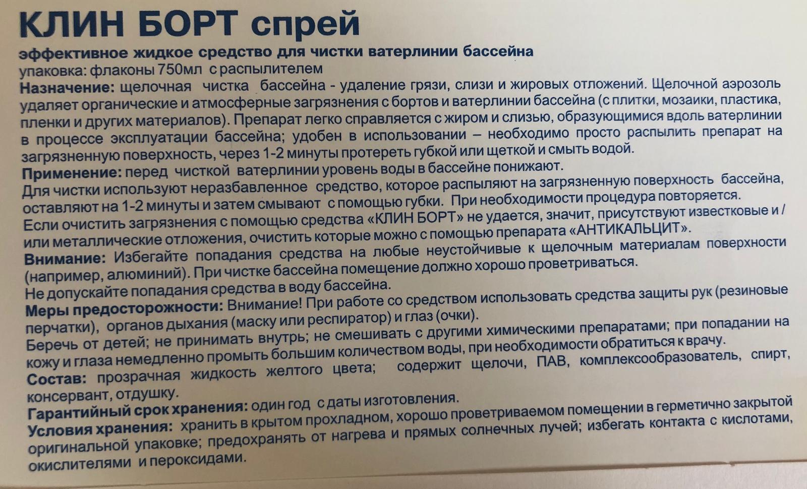 Клин борт спрей, применение: Перед чисткой уровень воды в бассейне понижают. Для чистки используют неразбавленное средство, которое распыляют на загрязненную поверхность края бассейна, оставляют на 1-2 минуты и затем смывают с помощью губки. При необходимости процедура повторяется.