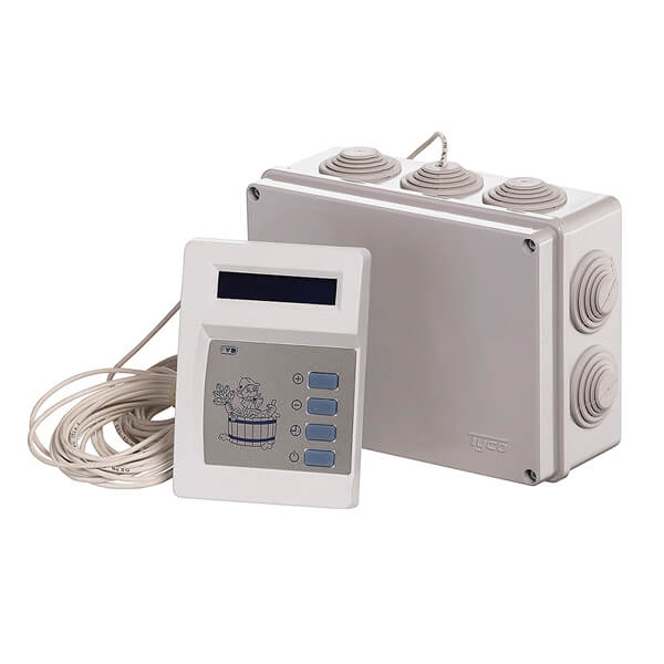 Пульт управления состоит из двух частей: блока управления и силового блока. Пульт управления оснащается датчиком температуры, расположенным вне пульта управления и устанавливаемым внутри парильного помещения. Датчик температуры подключается к пульту управления собственным кабелем длиной 5 метров. Материал изоляции кабеля – термостойкий силикон, температура эксплуатации до 200 °С. Во избежание некорректной работы ПУ увеличение длины соединительного кабеля не рекомендуется. В исключительном случае кабель может быть удлинён кабелем аналогичного сечения. Не рекомендуется прокладка соединительного кабеля параллельно и вблизи силовых кабелей.