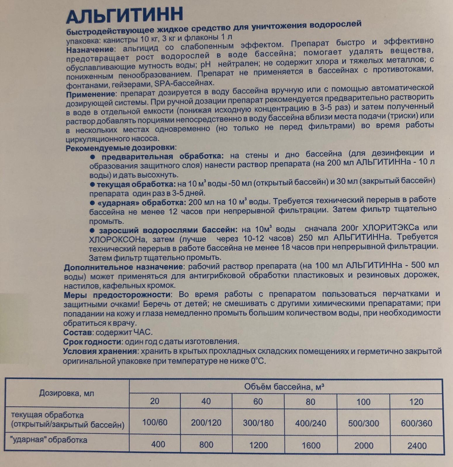 • предварительная обработка: на стены и дно бассейна (для дезинфекции и образования защитного слоя) нанести раствор препарата (на 200мл Альгитинна - 10 л воды) и дать высохнуть.
