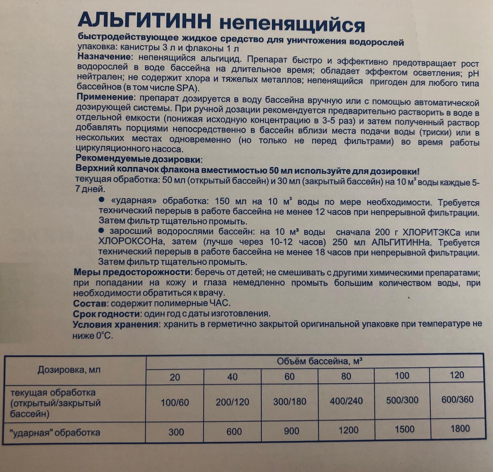 • предварительная обработка: на стены и дно бассейна (для дезинфекции и образования защитного слоя) нанести раствор препарата (на 200мл Альгитинна - 10 л воды) и дать высохнуть.