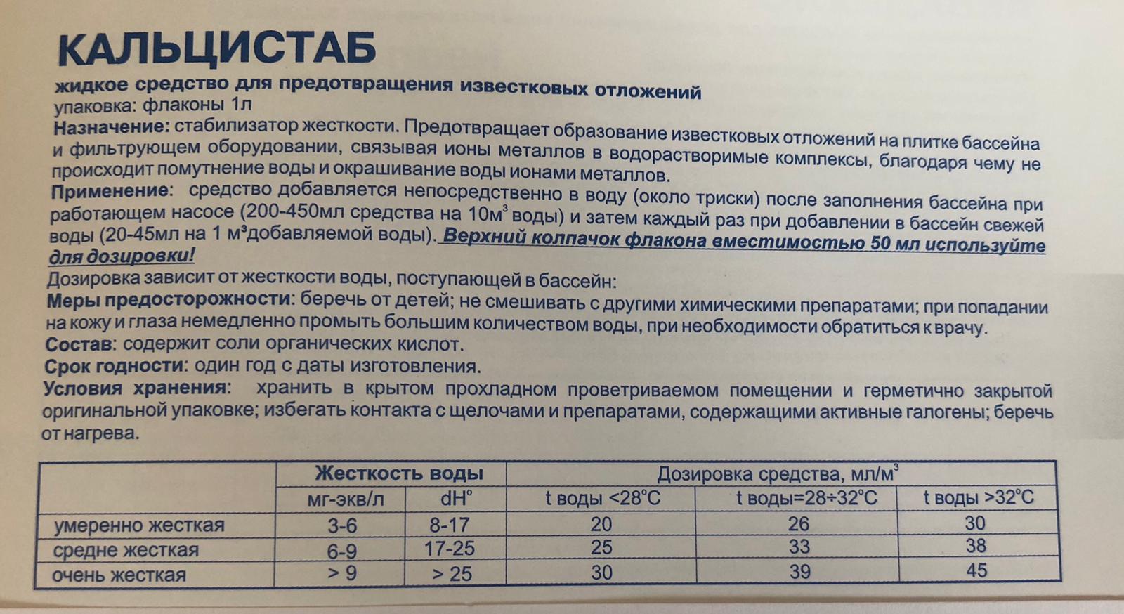 Химия для бассейна КАЛЬЦИСТАБ добавляется непосредственно в воду после заполнения бассейна при работающем насосе (200-300мл средства на 10 м3 воды) и затем каждый раз при добавлении в бассейн свежей воды (20-30мл на 1 м3 добавляемой воды).