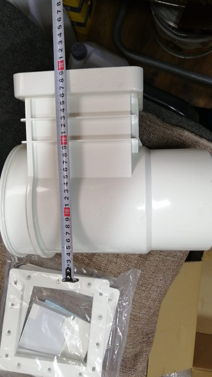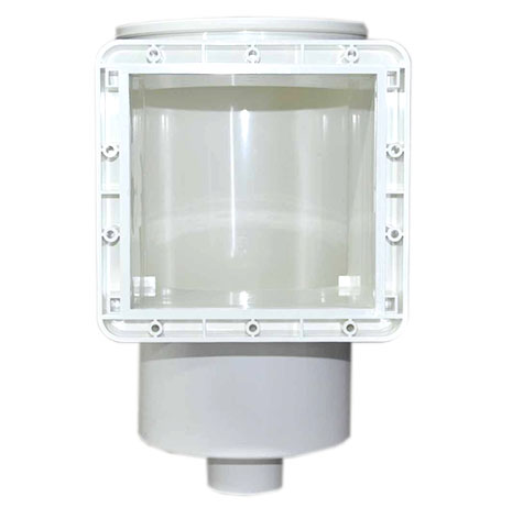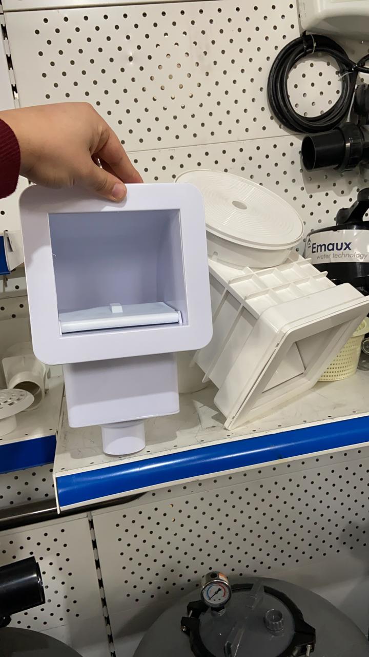 Скиммер представляет собой устройство для забора верхнего слоя воды из бассейна для дезинфекции, фильтрации и т.д. в нижней части к нему подключается трубопровод, сбоку есть прямоугольное окно с плавающей заслонкой, которая ограничивает сток нижних слоев воды, а значит более эффективный забор верхних и боле эффективную очистку от разного мусора. Характеристики: